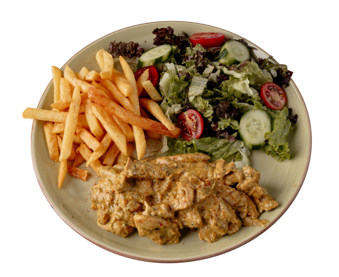 TAVUK GÖĞÜS PARÇALARI-KREMA-KÖRİ SOS-AKDENİZ YEŞİLLİKLERİ-CHERRY DOMATES-SALATALIK-PARMAK PATATES