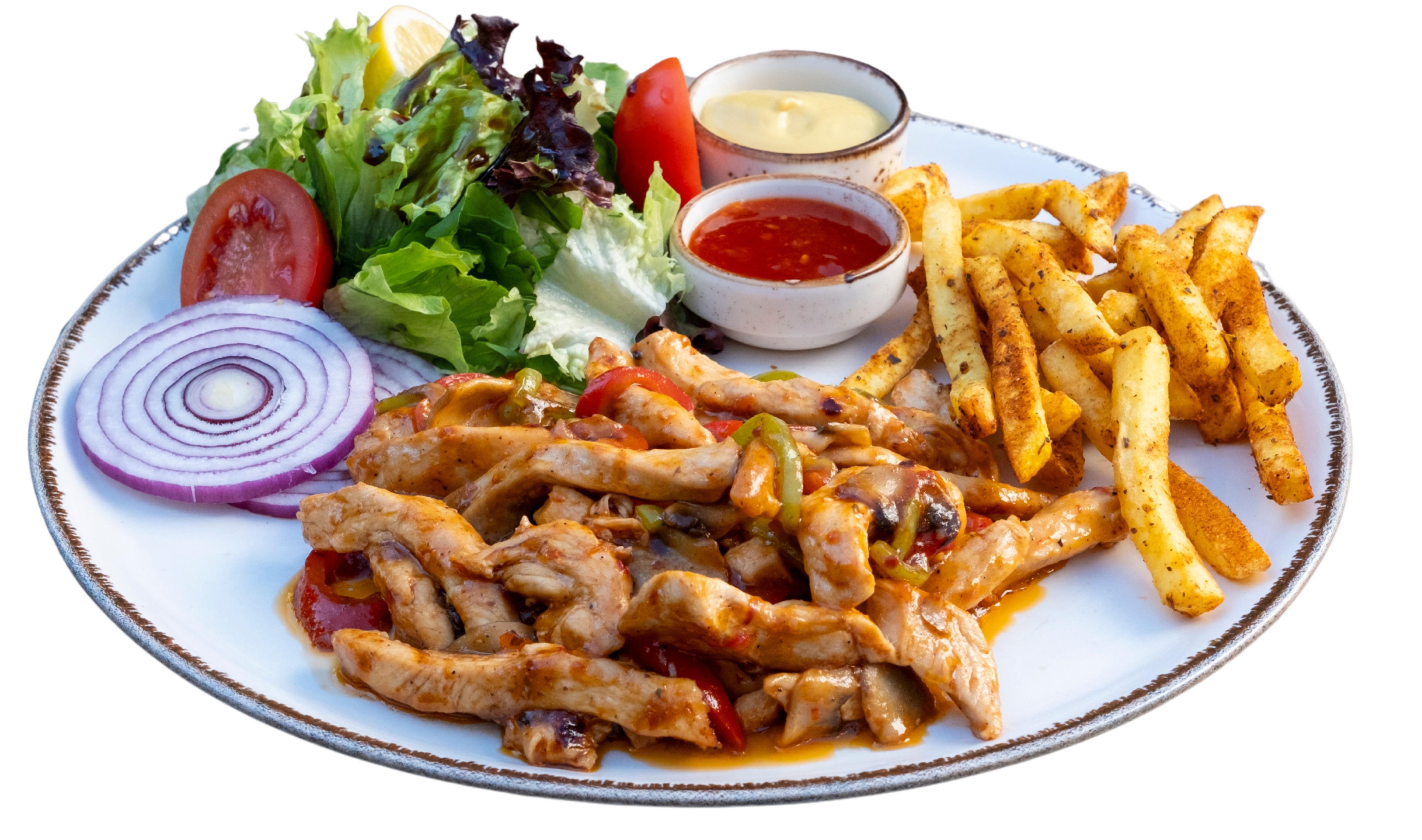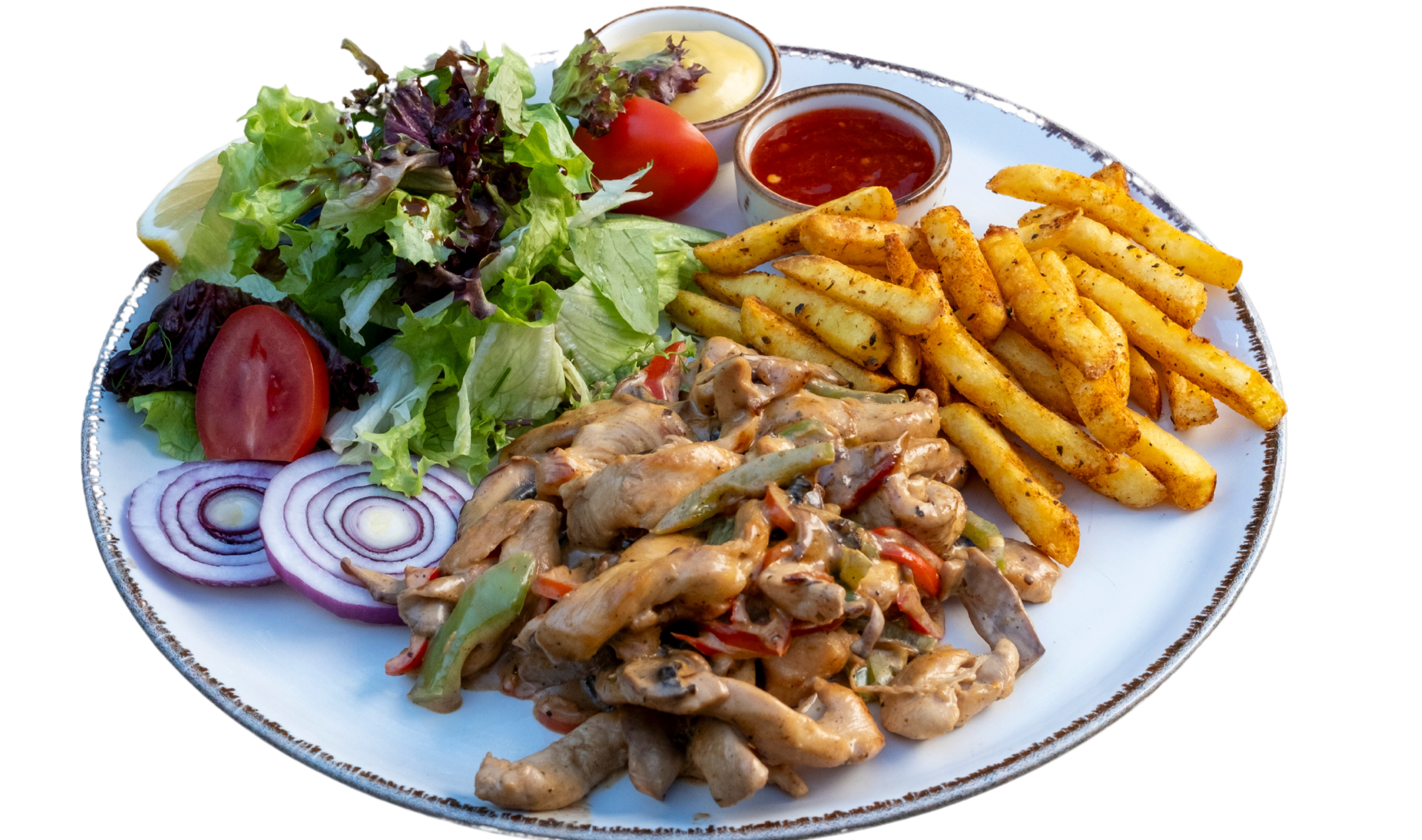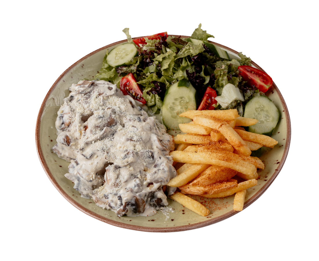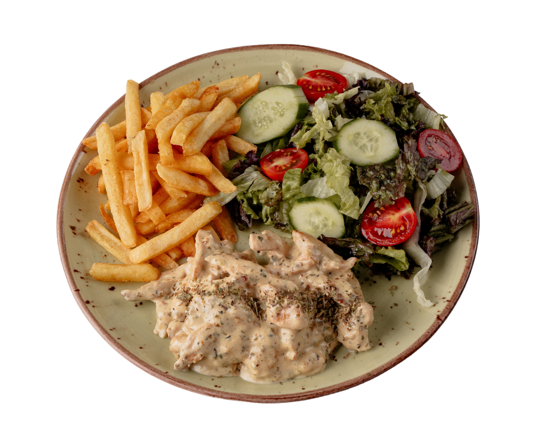 TAVUK GÖĞÜS-KREMA-MANTAR-AKDENİZ YEŞİLLİKLERİ-CHERRY DOMATES-SALATALIK-PARMAK PATATES