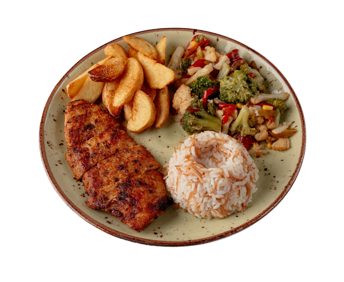 IZGARA TAVUK GÖĞÜS-PİLAV-HAŞLANMIŞ GARNİTÜR-ELMA DİLİM PATATES