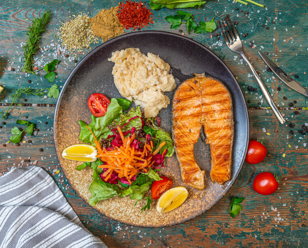 SOMON-PATATES PÜRESİ-KARAMELİZE SOĞAN-ROKA-CHERRY DOMATES