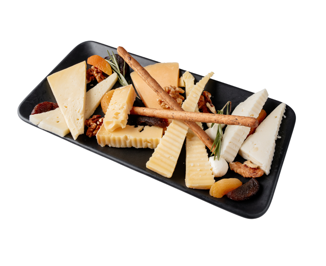 Gravyer, cheddar, gouda, isli çerkes, eski kaşar, ezine, İzmir tulumu, kuru kayısı ve ceviz