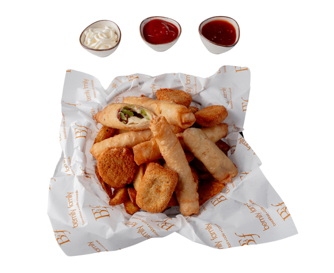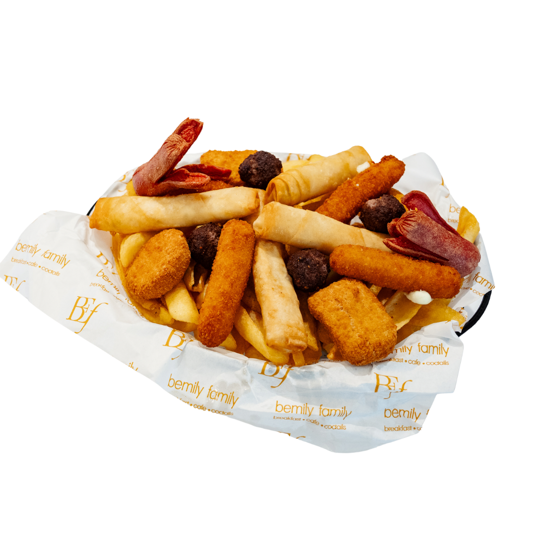 Patates kızartması, 4 adet soğan halkası, 4 adet sigara böreği, 2 adet sosis, 4 adet mozeralla stick, ve kornişon turşu