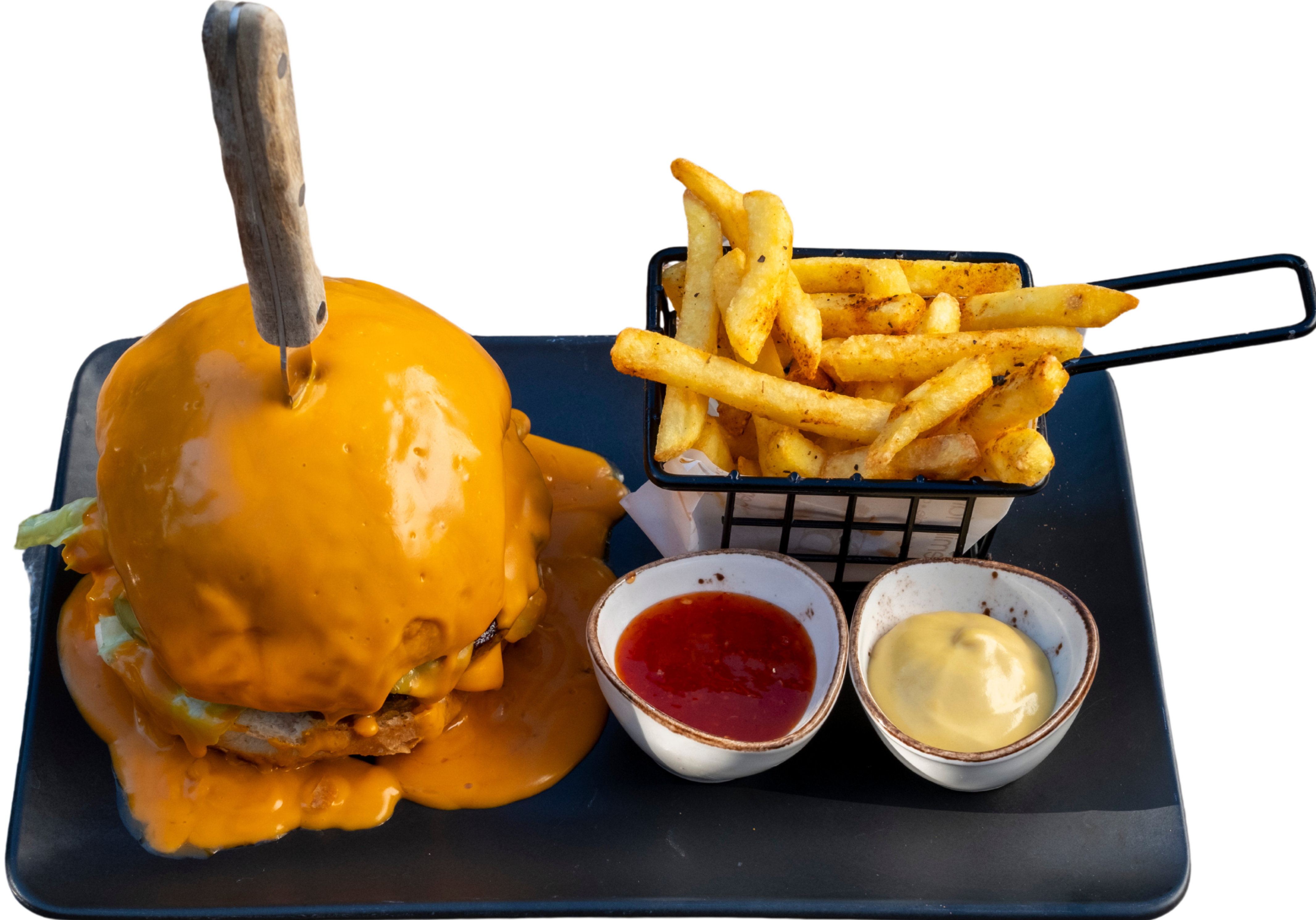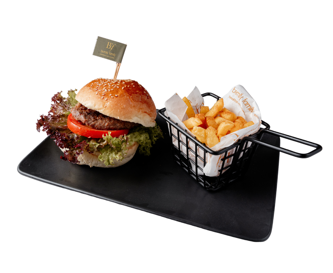 Hamburger köftesi, lolorosso, domates, kornişon turşu ve eritilmiş chedar