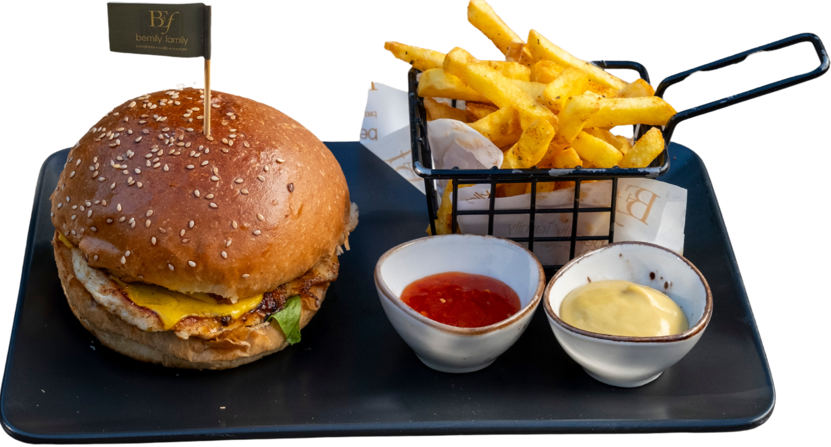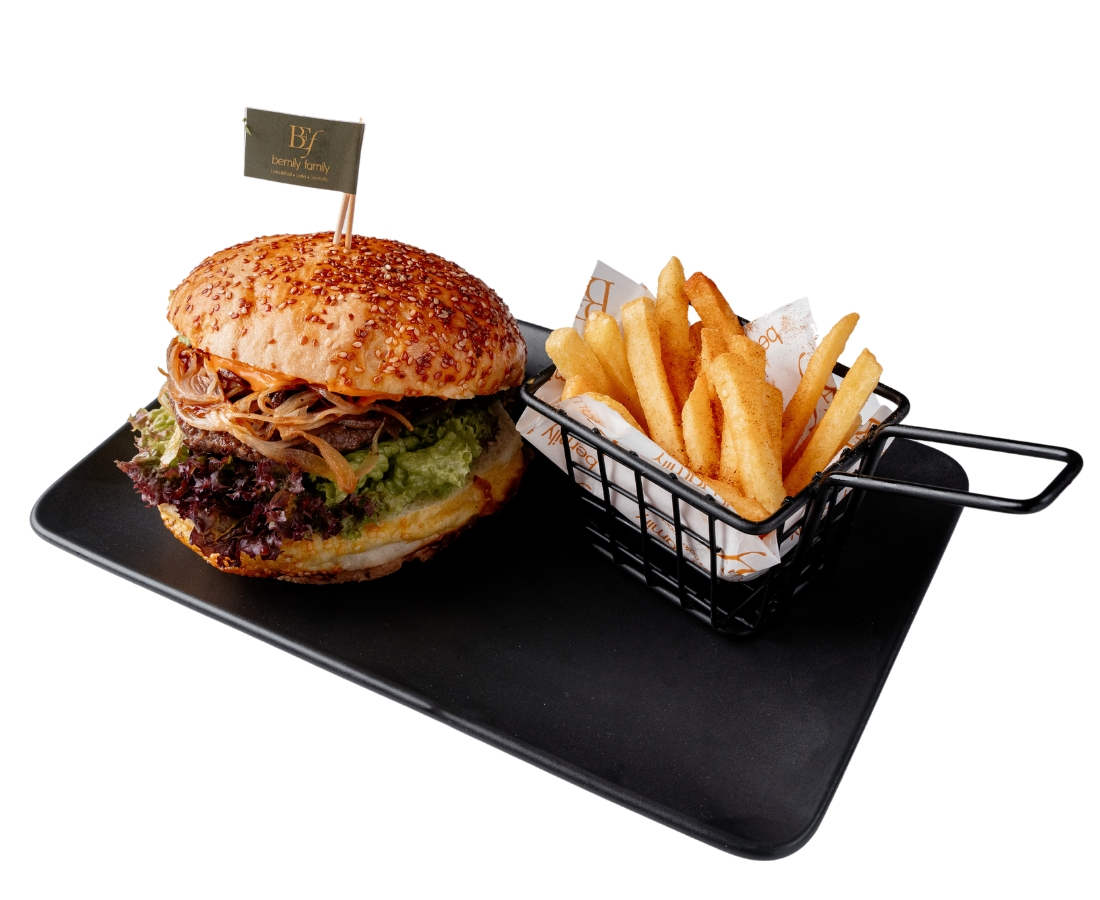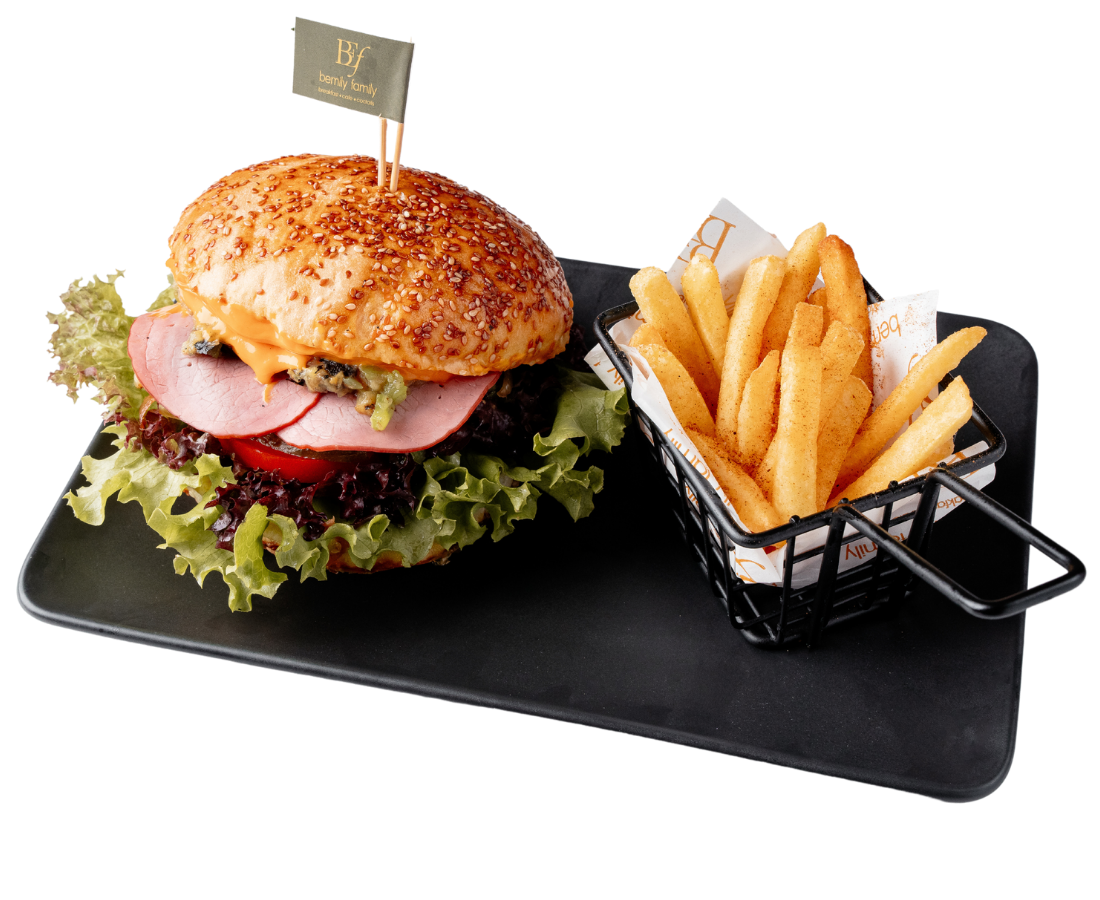 Hamburger köftesi, balon füme, cheddar peyniri, köz patlıcan ve biber sos, lolorosso, domates, kornişon turşu