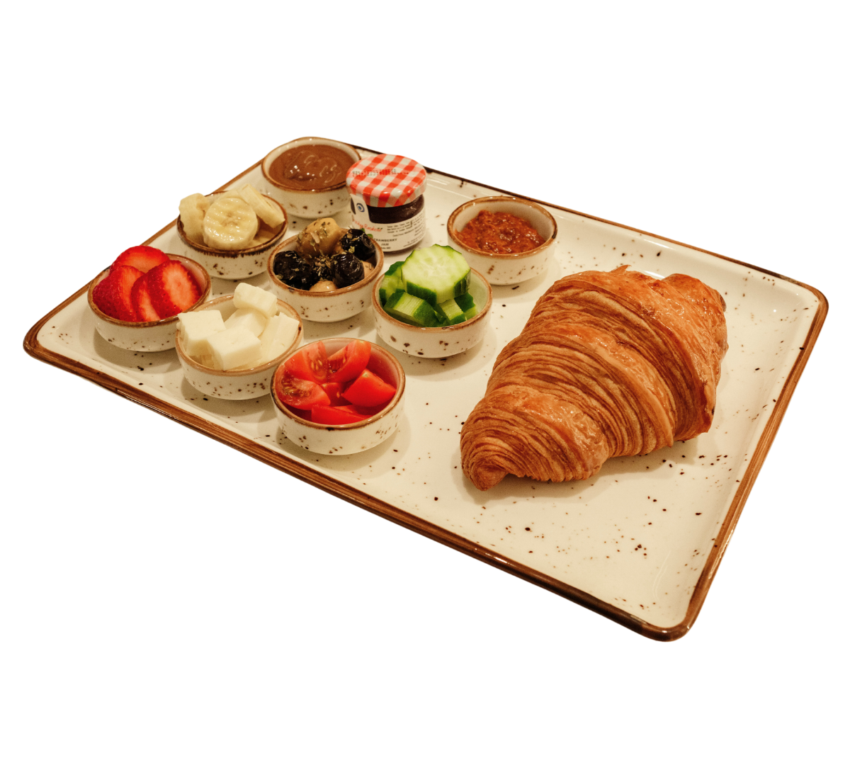 Bir adet kruvasan, ezine peyniri, cherry domates, salatalık, zeytin, acuka, reçel, nutella, muz ve çilek