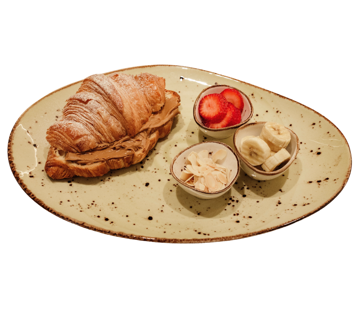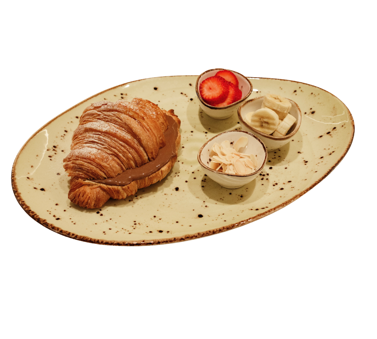 Kruvasan arası nutella, çilek, muz, file badem ve pudra şekeri