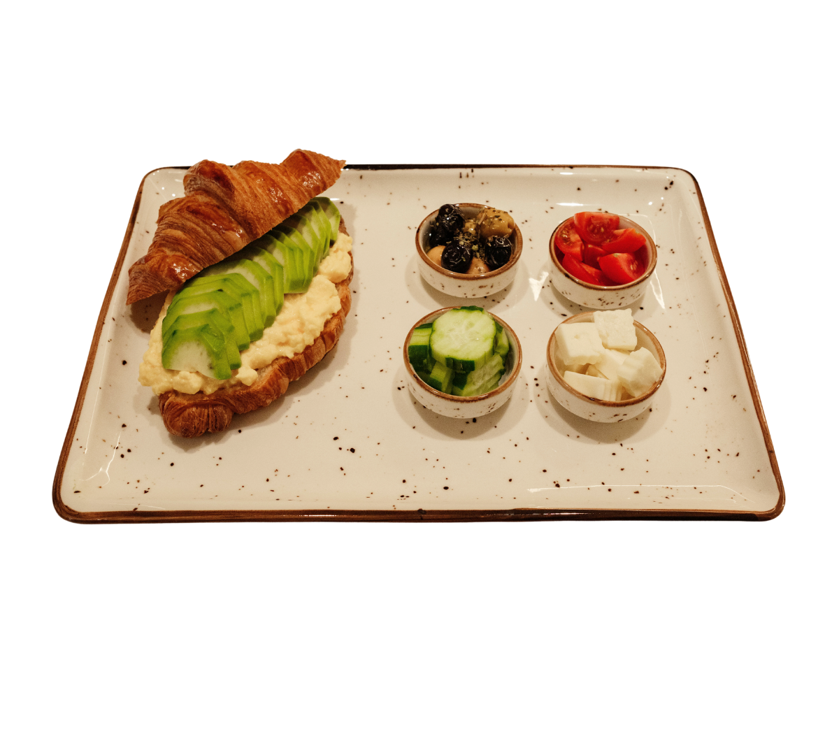 Avokado, yumurta, ezine peyniri, cherry domates, salatalık ve zeytin