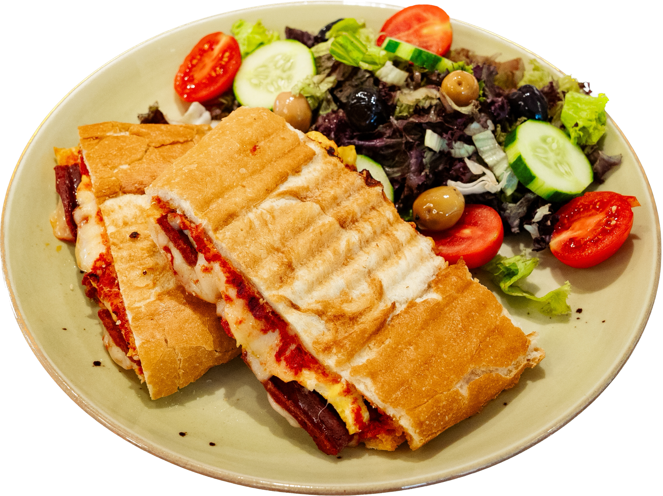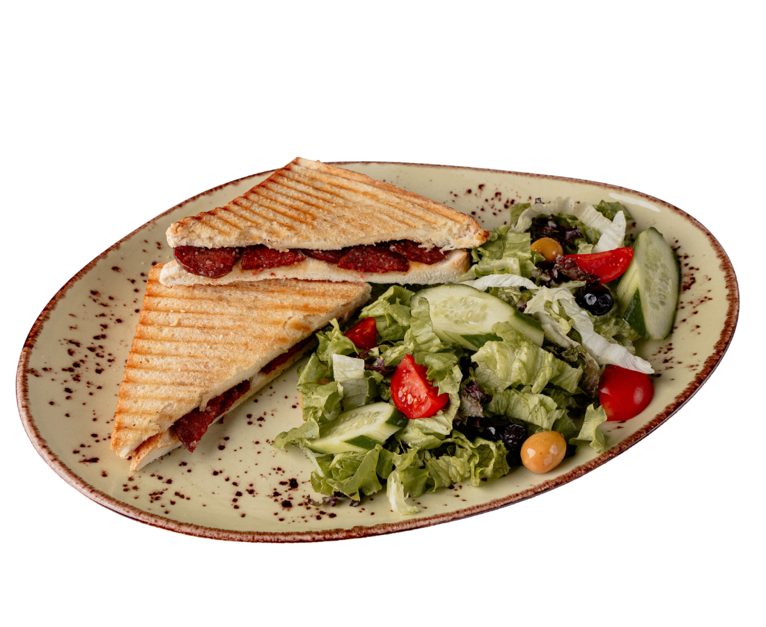Tost ekmeği, sucuk, Akdeniz yeşillikleri, cherry domates, salatalık ve zeytin