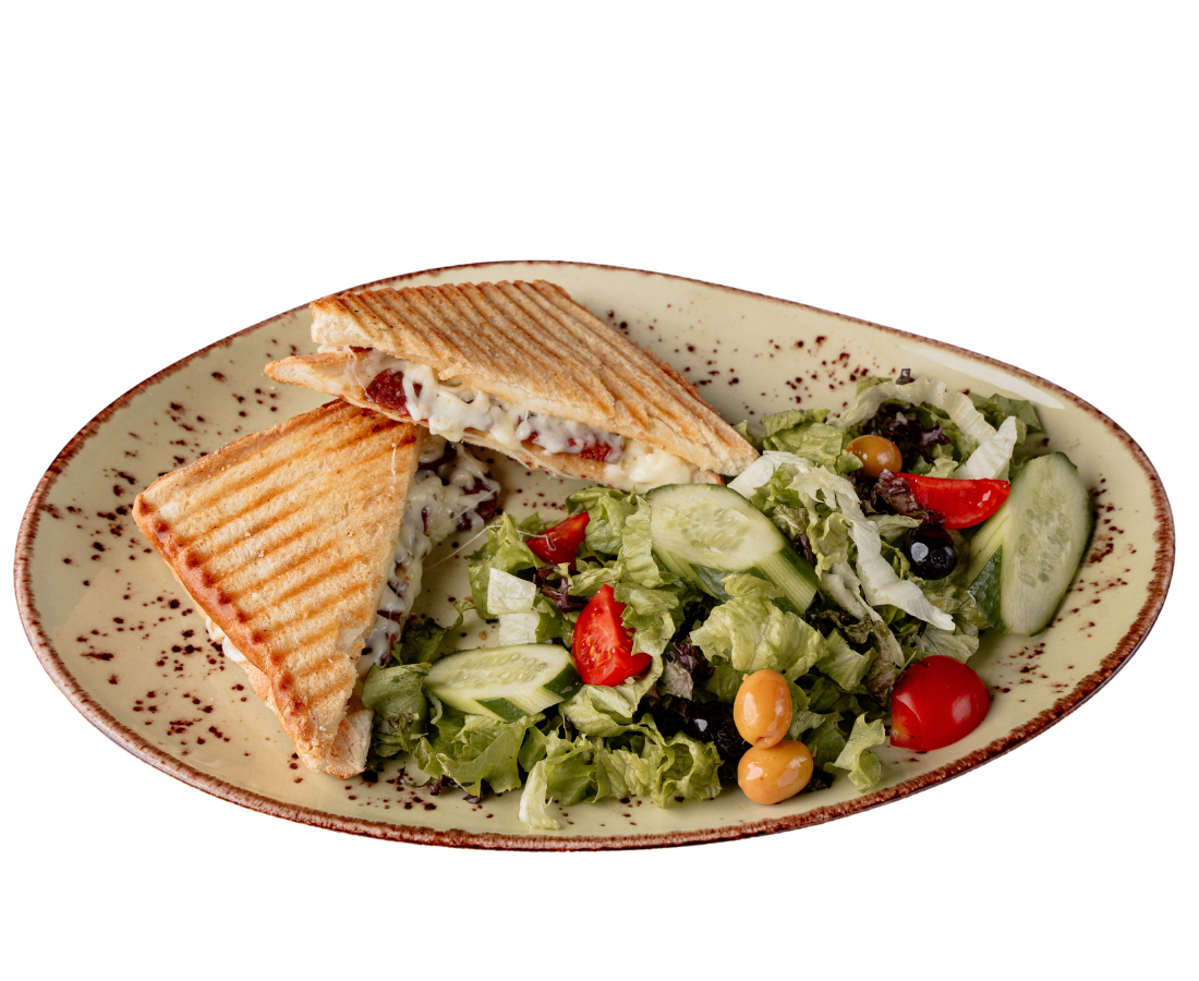 Tost ekmeği, kaşar peyniri, akdeniz yeşillikleri, cherry domates ve zeytin