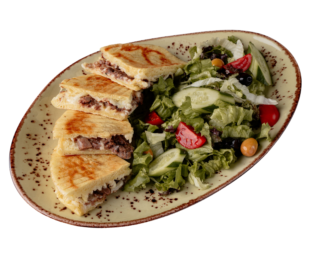 Bazlama ekmeği, kavurma, kaşar peyniri, Akdeniz yeşillikleri, cherry domates, salatalık ve zeytin