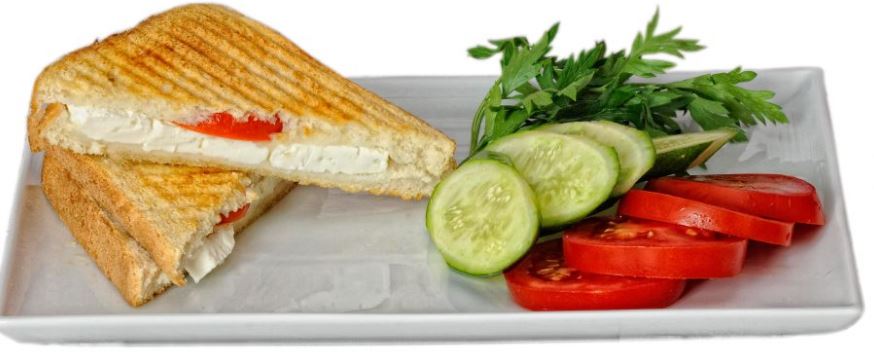 Tost ekmeği , beyaz peynir , domates , akdeniz yeşillikleri , cherry domates , salatalık ve zeytin.